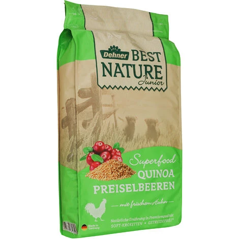 Mit Dehner Best Nature Trockenfutter Junior Superfood Quinoa Preiselbeeren geben Sie Ihrem Junghund nur hochwertige natürliche Zutaten, ohne Getreide und ohne andere künstliche Zusätze wie Farbstoffe, Zucker, Soja sowie gentechnisch veränderte Zutaten. Und dank eines schonenden Produktionsverfahrens werden alle Nährstoffe bestmöglich erhalten.