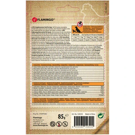 zusammensetzung: Huhn (78,8%), Glycerin (8%), Stärke (8%), Sorbitol (3%), pflanzliches Eiweiß (2%), Salz (0,2%).