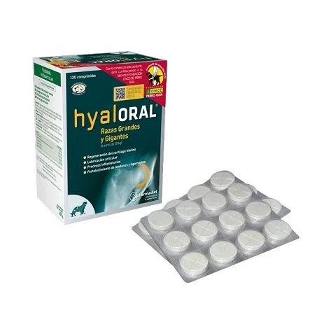 Hyaloral enth_lt die vollst_ndigste Formel, deren N_hrstoffe vor der Ùblichen Ern_hrung zur Entwicklung und Aufrechterhaltung von Gelenken, Sehnen und B_ndern beitragen. Die Sucht auf die Ùbliche Ern_hrung von N_hrstoffen, die hyaloral ausmachen, tr_gt zur Gelenkentwicklung und -aufrechterhaltung bei. Verwendungsart: 1 Tablet/20 kg Gewicht tagsÙber. Zusammensetzung: hydrolysiertes Schweinekollogenzymetisch, Glucosamin, Sysa -Hyaluronat, Chondroitinsulfat, Gamma Oizanol. Pr_sentation: Verpackung mit 120 Tabletten mit jeweils 5 g leicht teilbar, um die Einnahme zu erleichtern.